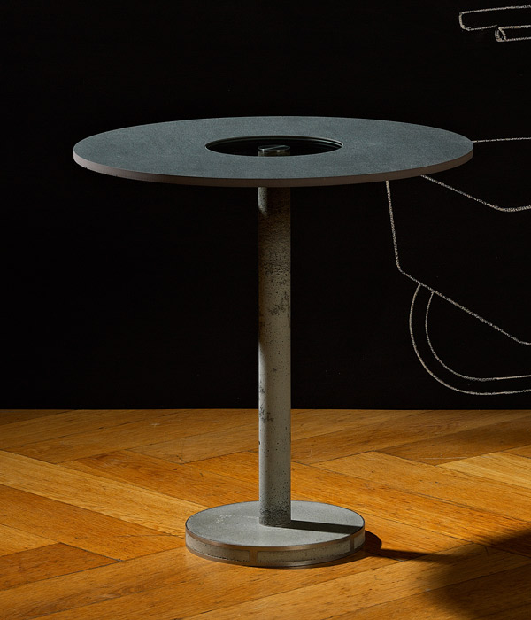 Feinbeton und Keramik - eine im Tischbau eher ungewöhnliche Materialkombination - prägt das Erscheinungsbild des Beistelltisches BBT.